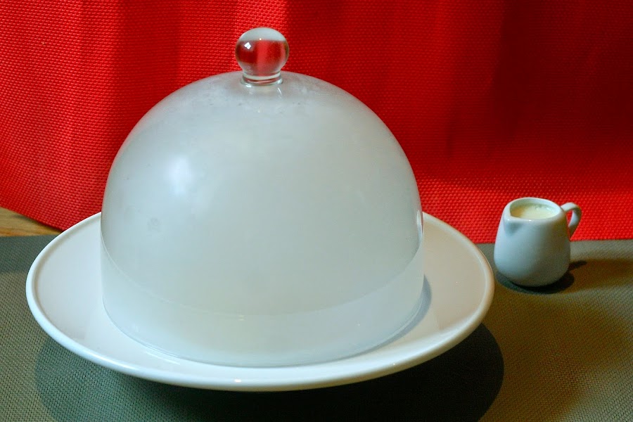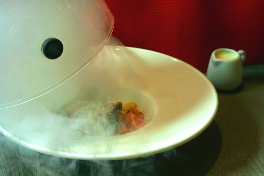 Con ayuda del ahumador y una campana ahumar durante un par de minutos el plato y servirlo así en la mesa para que el comensal abra la campana y pueda disfrutar del aroma de la madera ahumando el plato.