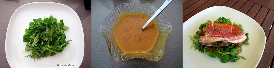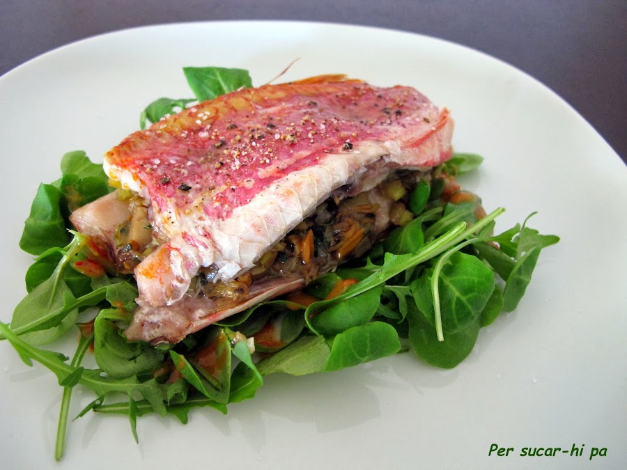 Para presentar el plato colocamos en el fondo una cama de hojas verdes, en este caso rúcula y canónigos, que aliñamos con una vinagreta al gusto. Encima ponemos un salmonete relleno, le retiramos con cuidado los palillos y a correr que no se enfríe.