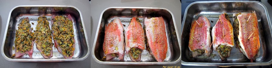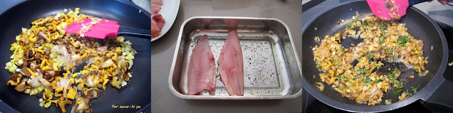 En una fuente de horno colocar en la base un chorrito de aceite de oliva, sal y pimienta, y disponer una capa de filetes de salmonete. Repartir el relleno de setas por toda la superficie de los filetes y tapar y con las otras mitades. Salpimentar y rociar con un poco de aceite. Asegurar los filetes con dos palillos para que no se desmonten. Hornear a 180º durante 10-15 minutos, vigilando que el pescado no se seque.