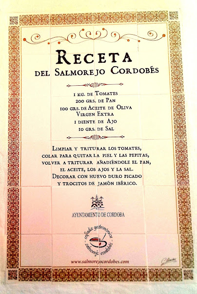 Da la casualidad que hace unos días pasé por Córdoba y tuve ocasión de disfrutar de su auténtico salmorejo, y mirad con lo que me topé en una de sus calles: la auténtica receta del Salmorejo Cordobés.