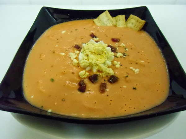 El salmorejo debe tener la consistencia de un puré o un poco mas espeso y en Córdoba se suele acompañar con trocitos de huevo cocido, jamón serrano y picatostes. Pero es cuestión de gustos, yo lo he probado incluso con atún y aceitunas verdes en alguna venta sin nombre.
