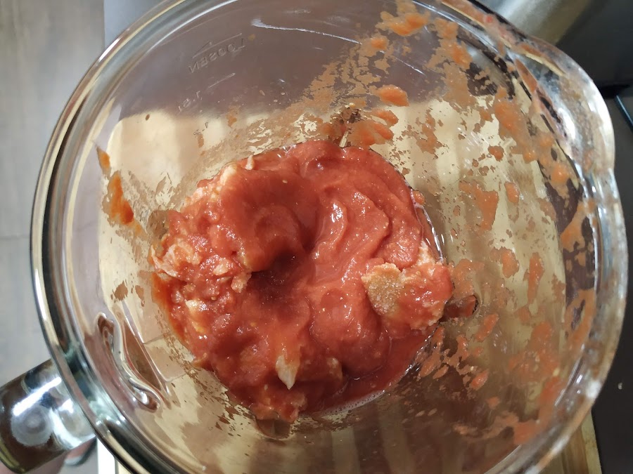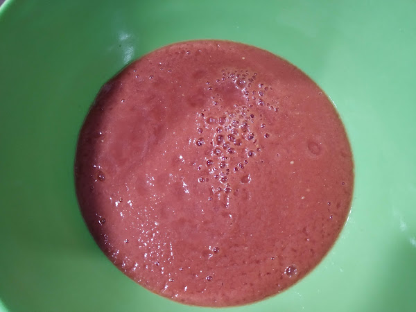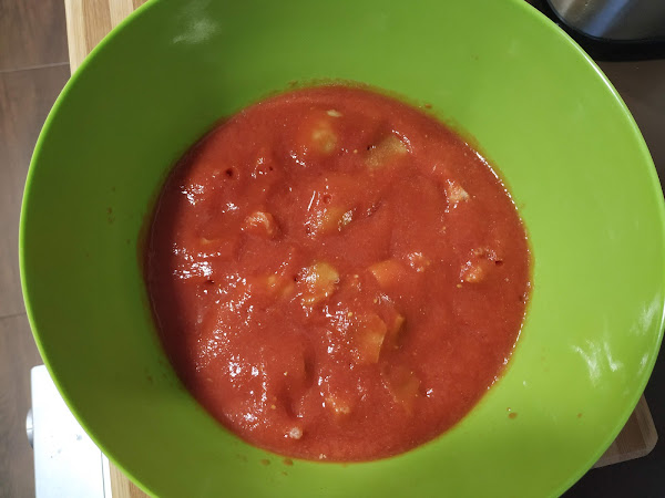 En primer lugar lavamos los tomates y los troceamos, a continuación lo ponemos en el vaso de la batidora y le damos para que se triture todo el tomate, seguidamente si queremos lo pasamos por un colador para que no quede ninguna pielecilla, (normalmente en la batidora de vaso no suele quedarse ninguna, pero podéis colarlo), a continuación pondremos el zumo de tomate obtenido en un cuenco o bol,