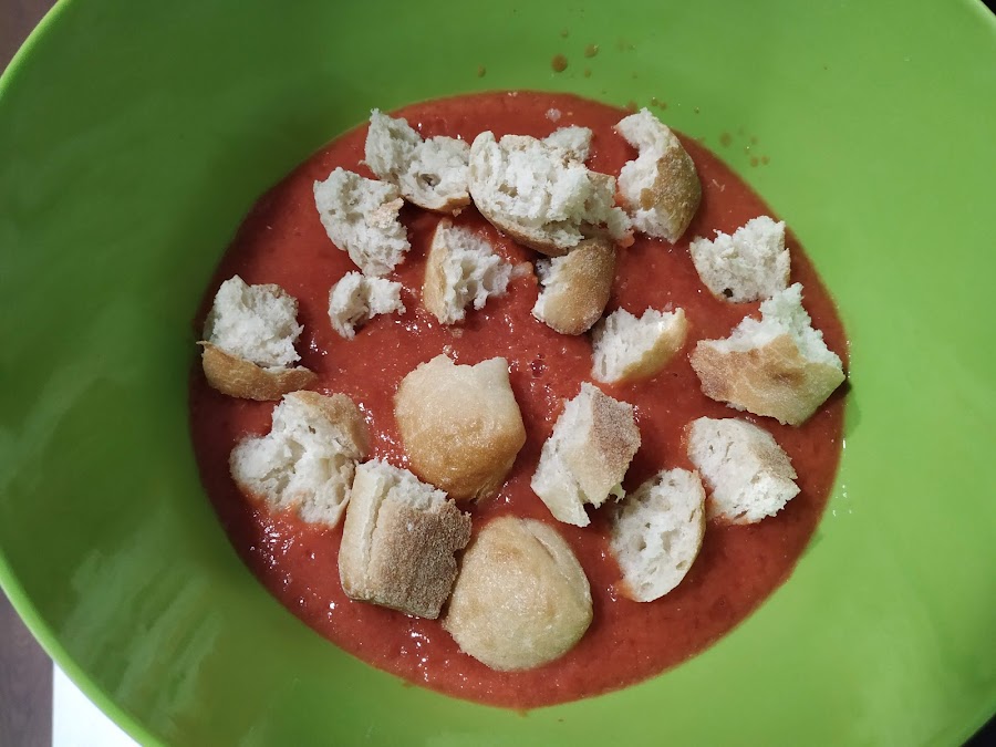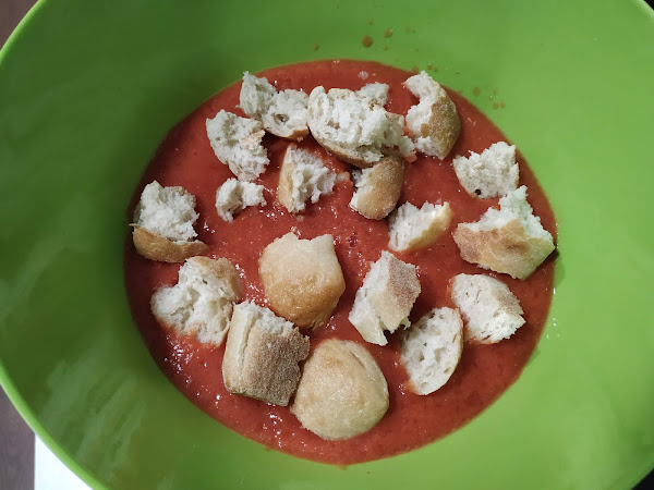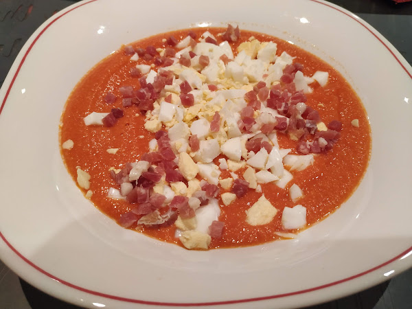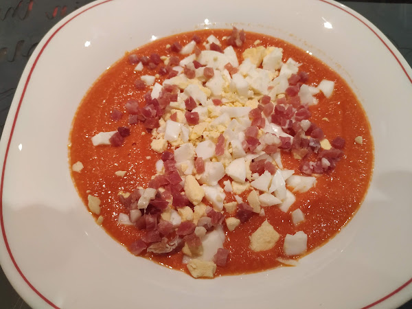 ahora probaremos y si vemos que nos queda un poco dulce podemos rectificarlo de sal, y batimos medio minutos más para que se mezcle bien la sal, ahora ya por último nos queda ponerlo en un recipiente de cristal (jarra, bote, etc...), y lo dejamos reposar en la nevera durante una hora aproximadamente, mientras se enfría cogeremos un cazo y pondremos agua y colocaremos los huevos dentro, cuando empiece a hervir el agua contamos unos 10 minutos aproximadamente para que se hagan duros los huevos, una vez pasado este tiempo los sacamos del fuego y enfriaremos con agua del grifo los mismos para que nos sea más fácil pelarlos, los pelamos y reservamos, ahora ya sólo nos queda servir nuestro salmorejo fresquito de la nevera, emplatamos y cogeremos y en cada uno de los platos cortaremos el huevos a trocitos por encima del salmorejo, y cogeremos unos taquitos de jamón y los ponemos por encima, y nada ahora ya a disfrutar de una comida sana, sencilla y muy buena para épocas de verano con el calor, pues ya se sabe que apetece algo fresquito y nutritivo y este plato lo contiene todo así que os animo a probarlo, buen provecho.