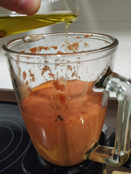 durante éste proceso iremos añadiendo el aceite poco a poco para que emulsione y quede integrado con todos los demás ingredientes,