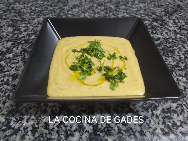 Echamos el salmorejo en el plato, un chorrito de aove y por encima cilantro picado. Listo para degustar.