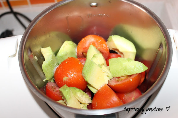 Poner en el vaso de la thermomix el ajo, los tomates lavados, el aguacate y la sal y la pimienta. Trituramos 30 segundos a velocidad 7-10