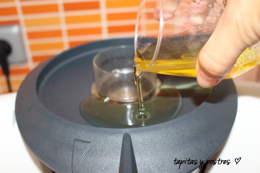 Programamos velocidad 4, sin tiempo, y vamos echando el aceite poco a poco sobre la tapa para que vaya escurriendo lentamente por el bocal. Así emulsionamos el salmorejo.