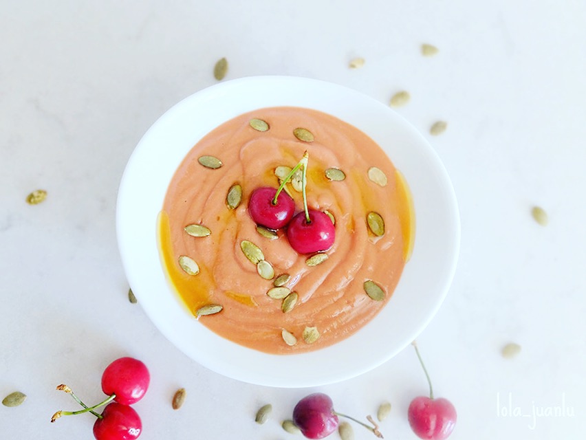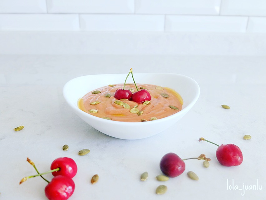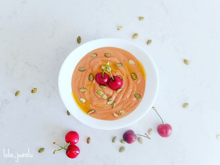 Lo podemos servir en un plato hondo, cuenco o cazuelita, como lo hacen en Córdoba. Rociamos con un chorreoncito de aove, espolvoreamos unas pipas de calabaza y colocamos unas cerezas para coronar el plato.