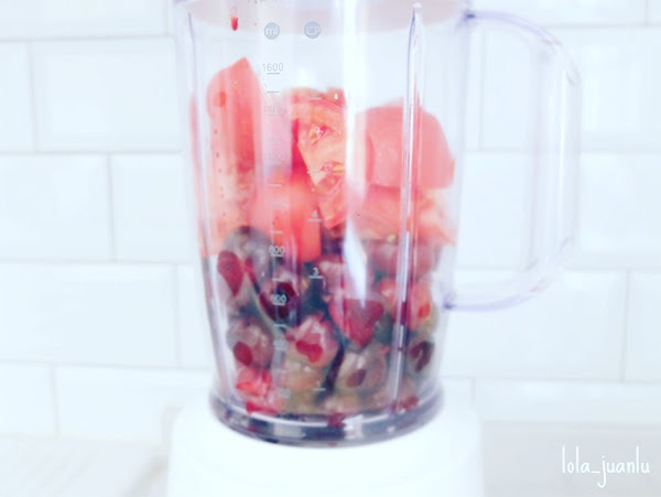 Una vez hemos terminado de deshuesar las cerezas, partimos en cuartos los tomates y los añadimos al vaso de la batidora, cerramos y batimos.