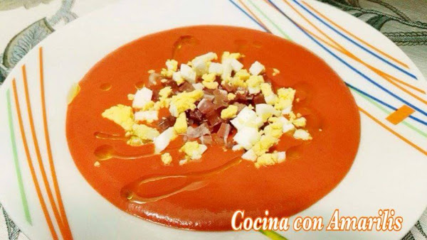 Mejor te explico paso a paso de una manera muy sencilla de cómo obtendremos una sopa fría muy sana y muy rica, que acompañaremos con huevo cocido y taquitos de jamón serrano como guarnición.
