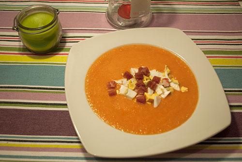 Ponemos el salmorejo en vasitos (si es para aperitivo) o en un plato, cuenco... y coronamos con un puñadito de huevo cocido y jamón.