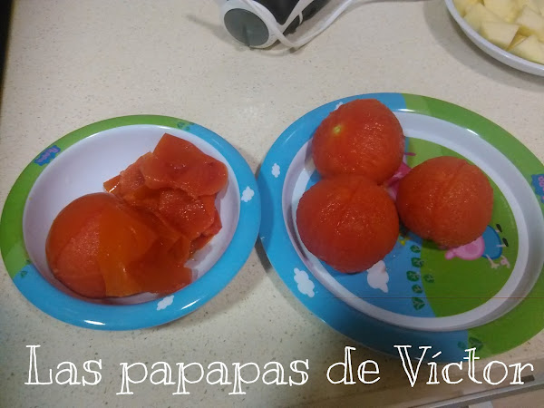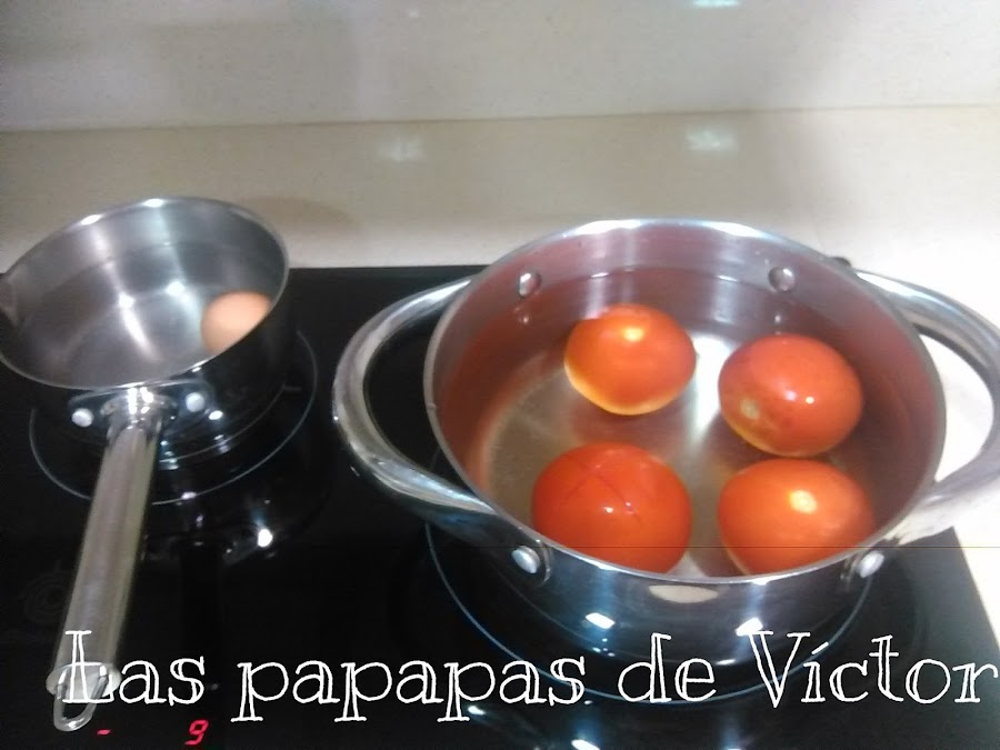 Hacer a los tomates una cruz con un cuchillo y ponerlos en agua hirviendo durante 1-2 min