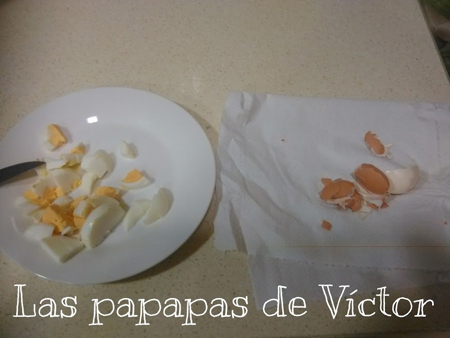 Poner a cocer durante 12 min el huevo hata hacerlo duro, entibiar, pelarlo y cortarlo a trocitos