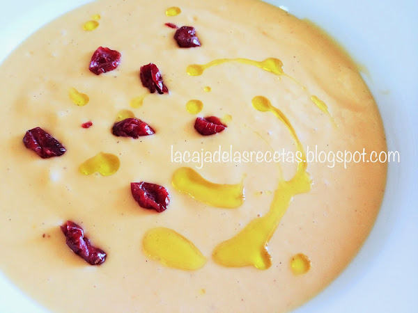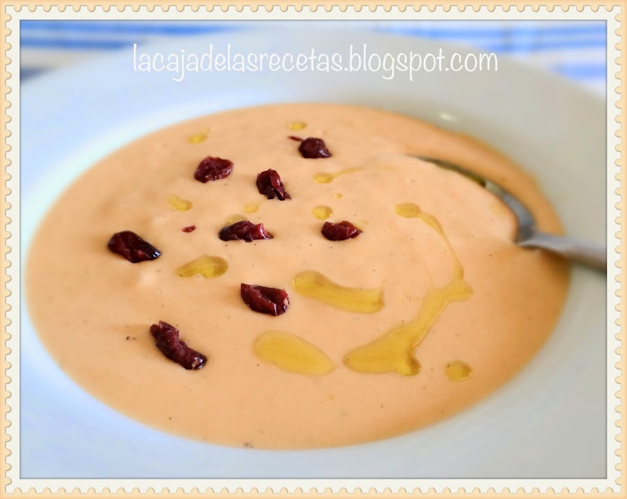 Pelar y trocear los melocotones y los tomates. Triturar todos los ingredientes con la minipimer lo más fino posible, y colar (o a máxima velocidad en la thermomix y no tendrás que desechar la fibra porque no es necesario este último paso de colar el salmorejo). Ya sólo queda servirlo bien frío y decorado por ejemplo con arándanos deshidratados y un poco de aceite.