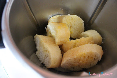 Cortamos el pan a rodajas y lo ponemos en el vaso de la thermomix o de la batidora que vayamos a usar, junto al zumo de naranja, el ajo y la sal. Trituramos 30 segundos a velocidad 5. Bajamos los restos de las paredes del vaso hacia abajo.