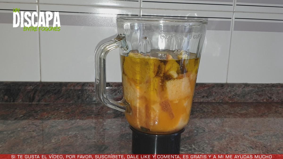 2Y ahora que ya tenemos la cantidad necesaria de zumo lo añadimos a un vaso batidor. Y en ese mismo vaso batidor añadimos también el pan, medio diente de ajo al que le hemos quitado el germen, una cucharada de vinagre, una cucharadita de sal y el aceite de oliva. Lo dejamos así unos minutos para que el pan se vaya empapando bien.