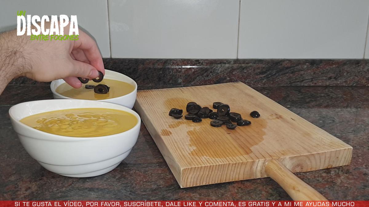 5Aquí tengo unas aceitunas negras que voy a cortar en rodajas para decorar el salmorejo. Pero esto es totalmente opcional, si no queréis ponerselas no pasa nada. O si preferís ponerle alguna otra cosa, pues adelante.