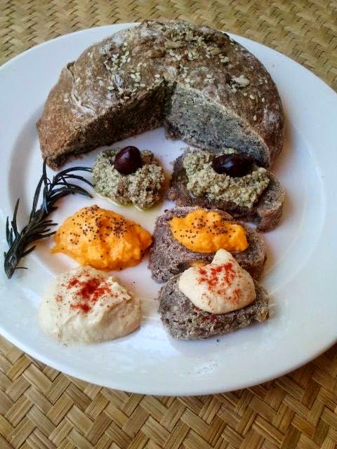 Por unos 250 gramos de papaya limpia echar 100 ml de aceite de oliva virgen extra, un par de ajos, sal y un pedacito de pan duro integral. Primero echar la papaya, el aceite, los ajos y la sal, y dependiendo de espesor deseado se añade el pan duro o pan rallado. Corregir la sal si fuese necesario y envasar y enfriar. Nosotros la hemos decorado con semillas de amapolas al servirla.Humus del Líbano: Podéis encontrar la receta en el apartado " Salsas"