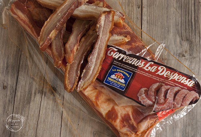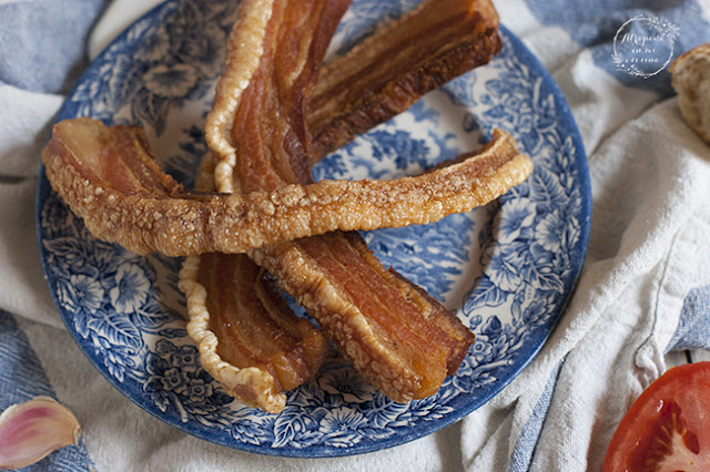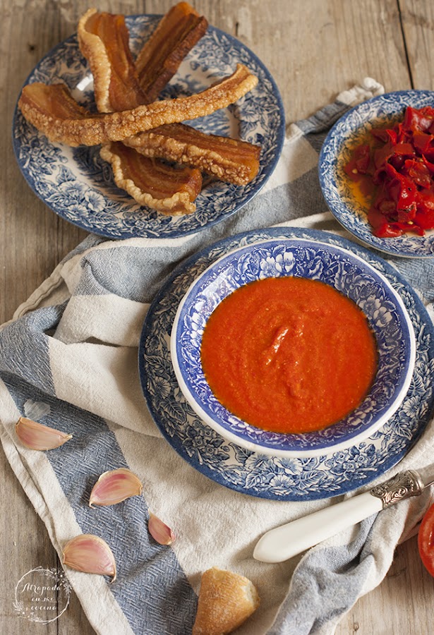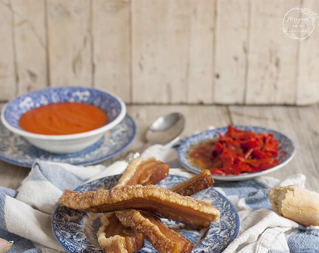 Desde la Marca de Garantia Torrezno de Soria me ofrecieron probar su producto y elaborar una receta con él. Aunque podemos verlo en muchos supermercados ya terminados nada tienen que ver con los formatos que me enviaron desde Embutidos La Despensa para que en casa pudiera hacerlos. Lejos de ser una panceta como puede parecer a simple vista, nada tiene que ver con ella. No en vano es llamada la ventresca del cerdo, la panceta adobada con marca de garantía. He recibido dos formatos como os decía más arriba, los semifritos o precocinados, listos para preparar en cinco minutos, y la panceta adobada, que requiere una elaboración más larga. Opté por preparar los semifritos para acompañar este salmorejo de pimientos del piquillo, dejando la panceta adobada para una ocasión especial.