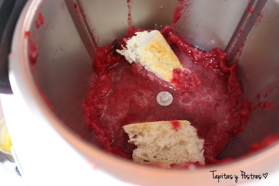Incorporamos el pan, vinagre y agua y volvemos a triturar.
