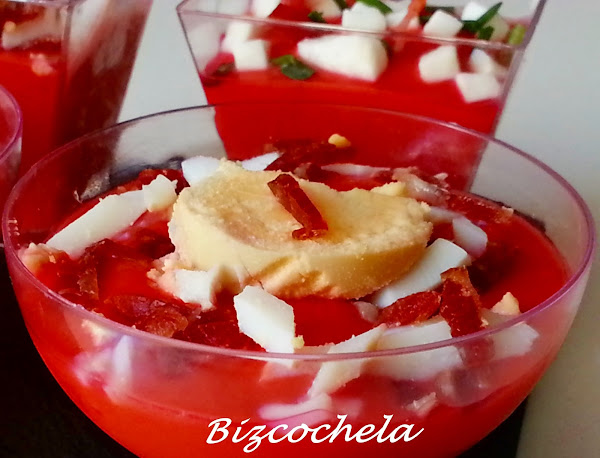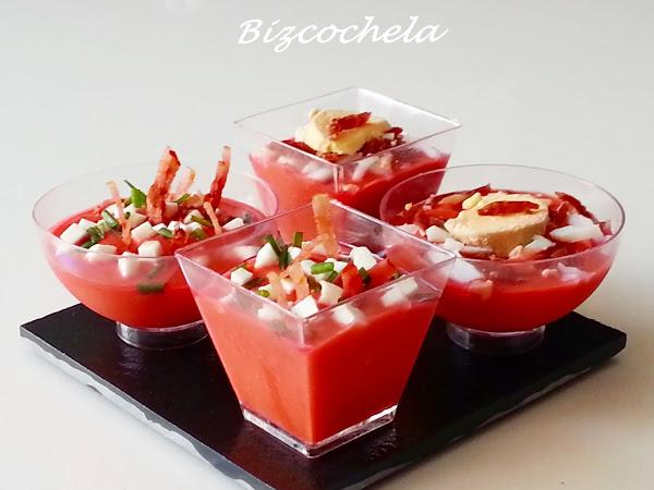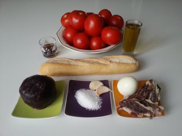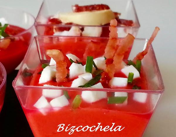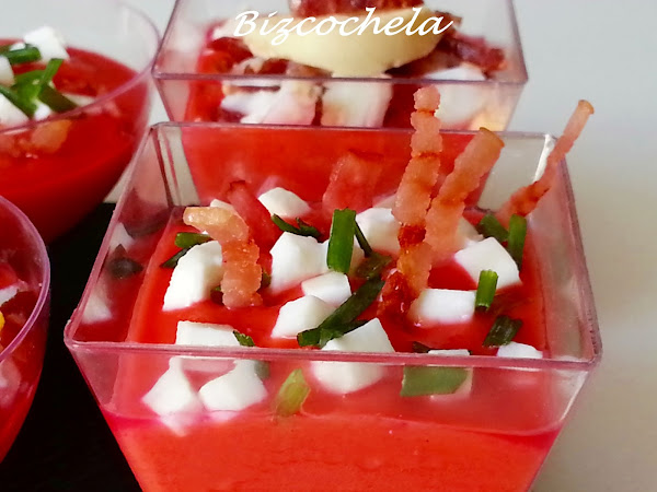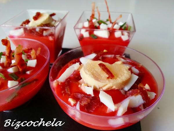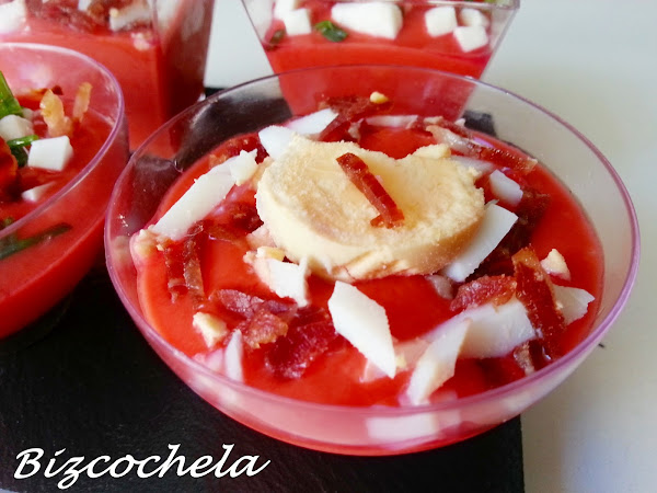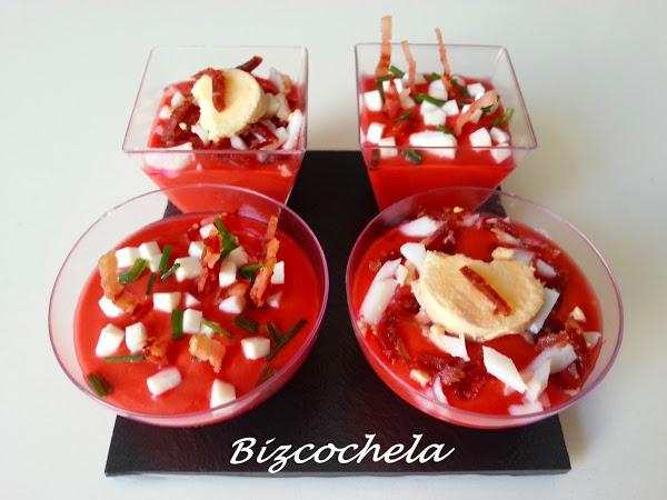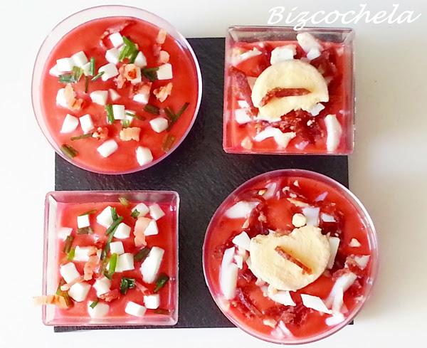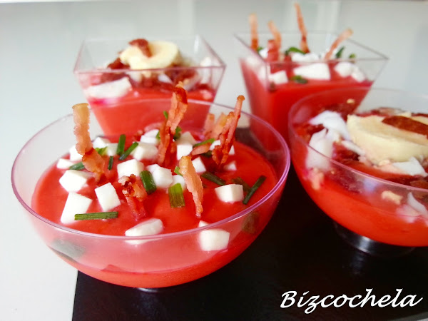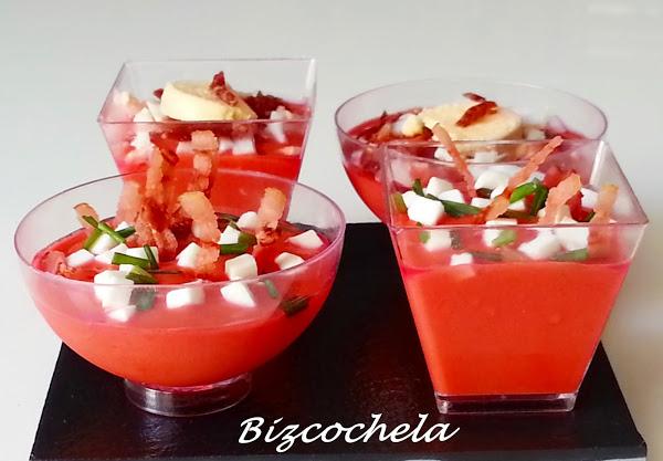 La verdad es que el procedimiento es exactamente igual que el salmorejo que publiqué en su día, pero al que le he añadido remolacha, y le he cambiado también los "tropezones"