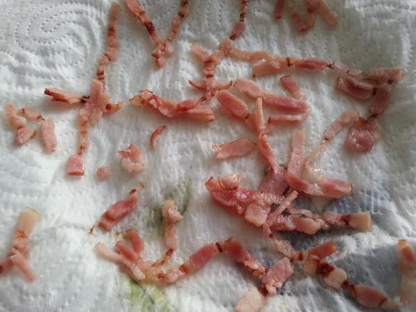3. - Mientras, cortamos el bacon en tiras, lo colocamos sobre papel absorbente y lo tapamos, y metemos al microondas un minuto. Si vemos que no queda crujiente, lo ponemos 30 segundos más, esto dependerá del grosor del bacon.
