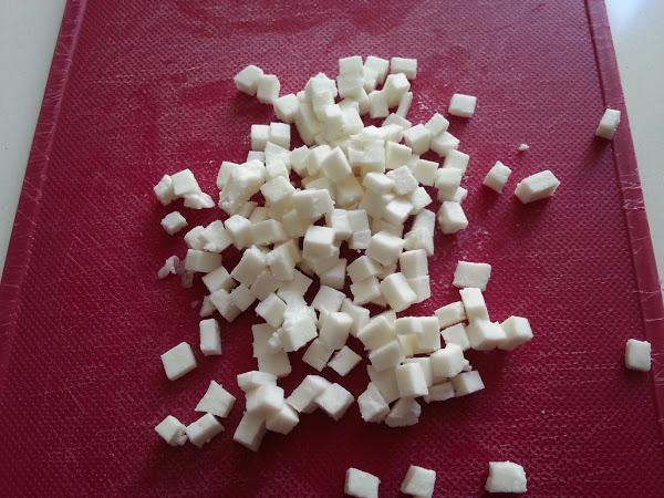 4. - Cortamos el queso en daditos muy pequeños, ya que lo iba a presentar en vasitos pequeños.