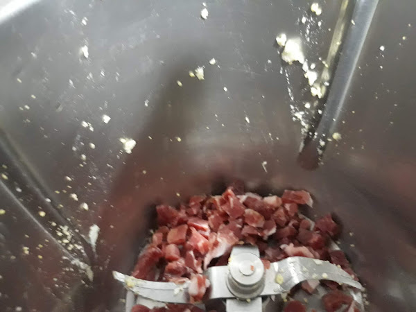 2.- Ahora hacemos lo mismo con el jamón y picamos con dos golpes de turbo de 2 segundos. Las veces van a depender de cómo os guste el jamón de picado, o también va a depender de lo duro que sean los taquitos de jamón. Reservamos en otro bol.