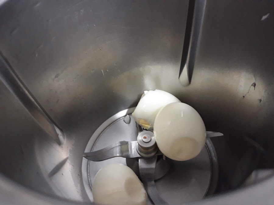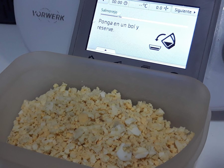 1.- Ponemos en el vaso los huevos duros y los picamos dos segundos, velocidad 4. Reservamos en un bol.