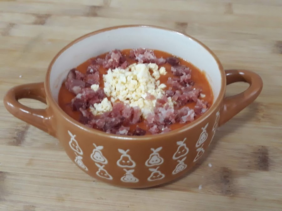 En casa somos más de gazpacho andaluz y he aquí, que tenía ganas de probar el salmorejo para saber la diferencia entre uno y otro. La primera que me encontré es que no se pone agua y eso hace que tenga una textura más espesa. Eso hace que lo considere más una crema (tipo vichyssoise) con un acompañamiento genial como es el huevo duro y el jamón. Además por lo espesa que me salió, me dio la idea de hacerlo como canapé en algún evento que tenga, sobre todo si es cena.