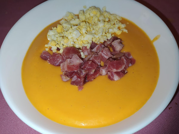 A la hora de servir acompañamos nuestro salmorejo de huevo duro picado y unos taquitos de jamón..