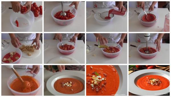 Los cortamos en trozos a groso modo y los echamos en un bol amplio; después los trituramos muy bien con la ayuda de la batidora, robot de cocina,… hasta conseguir una sopa de tomate.