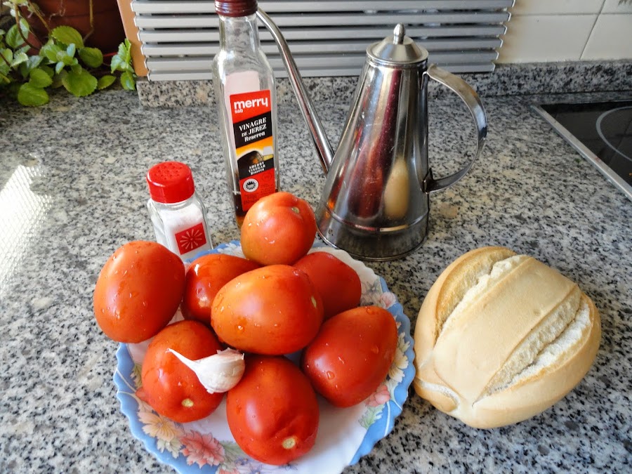 sal Si tenéis robot de cocina se pone todo en el vaso, no hace falta pelar los tomates, pelamos el ajo, troceamos el pan, agregamos el aceite, vinagre y sal y se tritura todo hasta que quede bien fino.