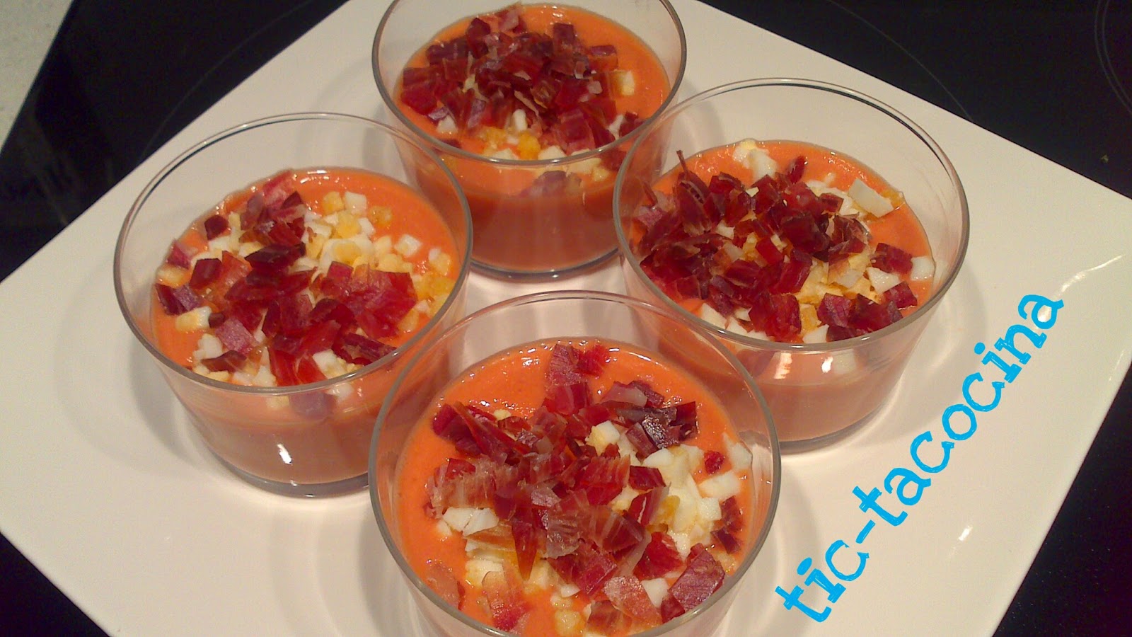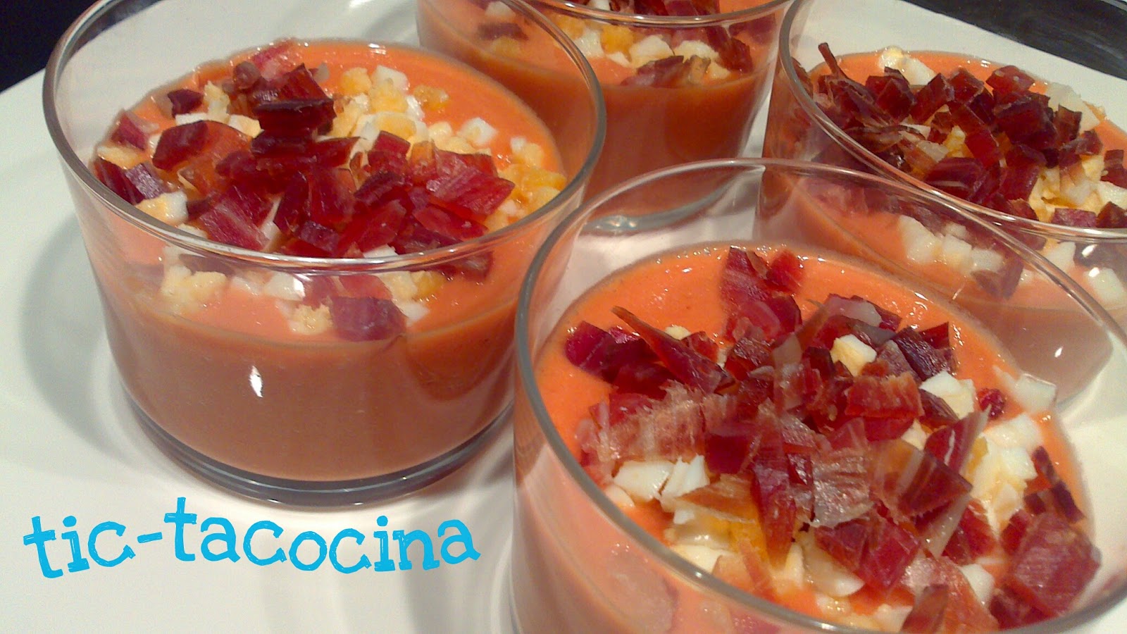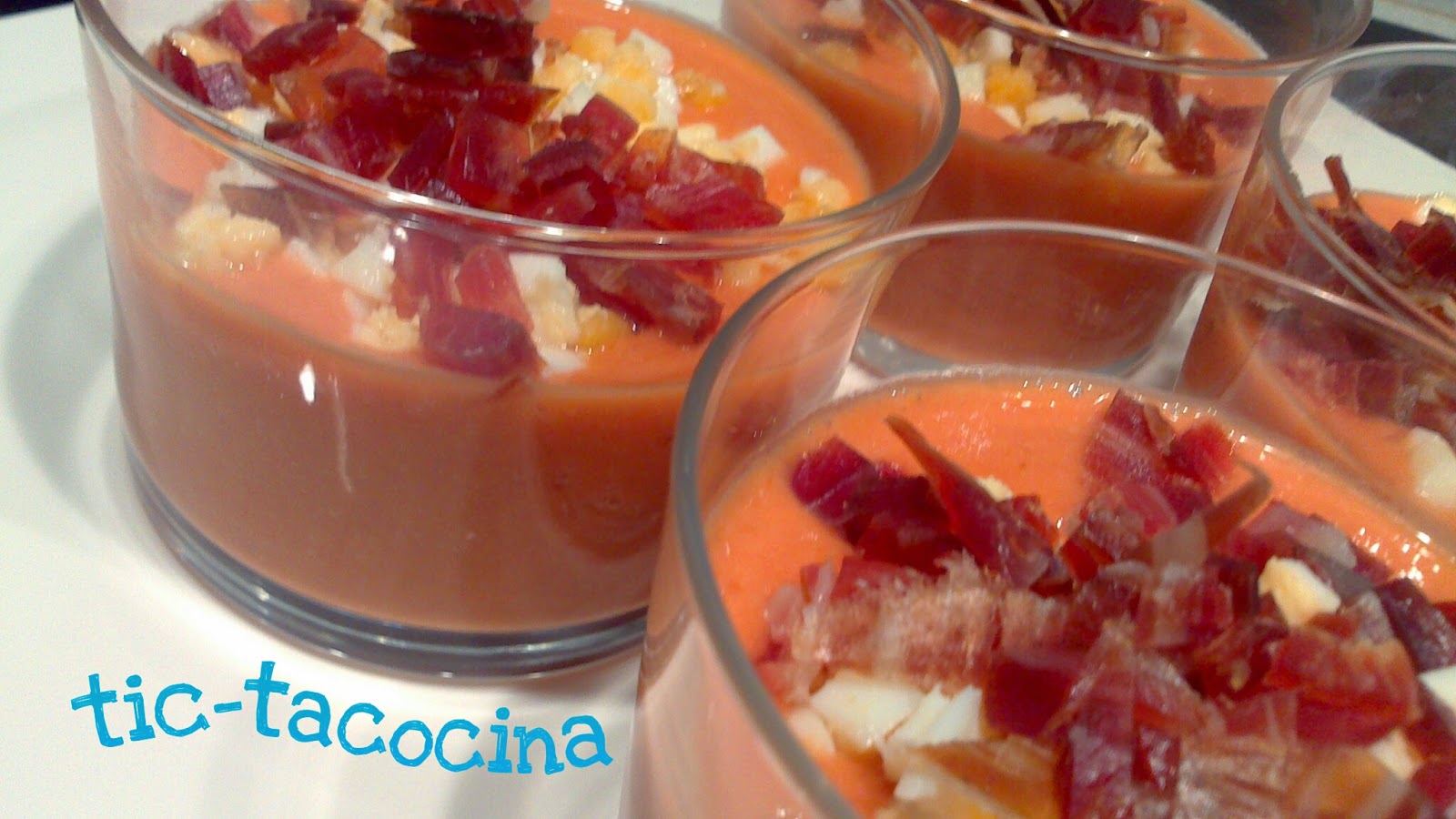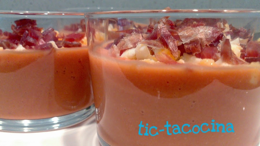 Entre otros, no han faltado el jamón, la tortilla de patatas y este salmorejo que he presentado en estos vasitos tan cucos.