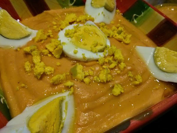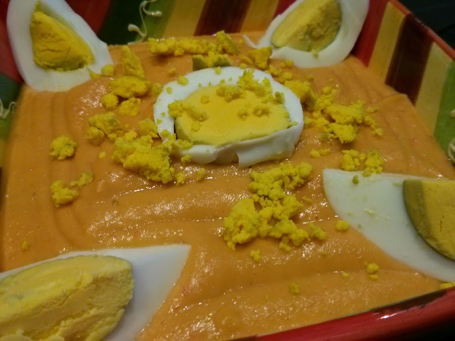 - batir la miga escurrida con el resto de ingredientes, y servir adornado con el jamón y el huevo.