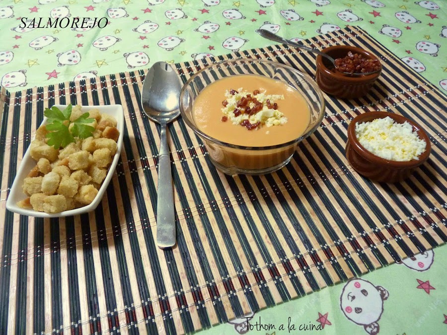 Aunque la apariencia es la del gazpacho, en el salmorejo no se utiliza los mismos ingredientes. Es ideal como entrante y en el aperitivo, servido en vasitos queda muy apropiado.