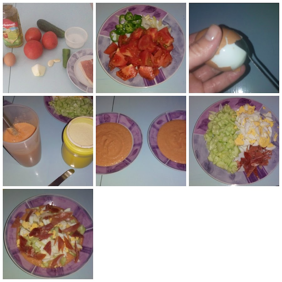 Luego se echa el salmorejo en un plato y se adorna con los huevos, el pepino y el jamón.