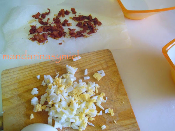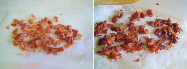 Corta el jamón serrano en trocitos, ásalos en el horno para que se tuesten un poco y quede crujiente.
