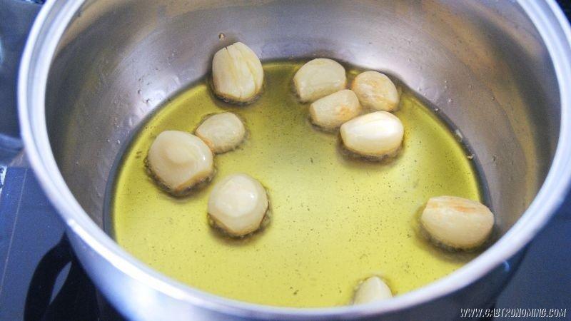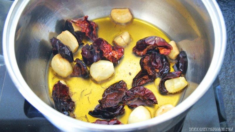 1. Calentamos el aceite de oliva a fuego medio, medio alto y sofreímos los ajos unos 4 minutos.2. Añadimos las ñoras y freímos 2 minutos más.