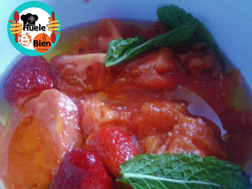 3.- Lavamos las fresas y le quitamos el rabito. Las ponemos en el bol, o en el vaso de la batidora. Añadimos 1/2 vaso de aceite de oliva, el vinagre, la hierbabuena, salpimentamos y trituramos todos los ingredientes.