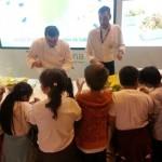 La zona más divertida era la dedicada a la formación de los más jóvenes. Allí vimos infantes de 10 años, todos con su pañuelo japonés en la cabeza, escuchando atentos al profe y afanándose en la confección de makis, otro grupo aliñando aceitunas e informándose sobre ese producto tan nuestro… daba gusto verlos! Nosotros somos de la opinión de que sería muy recomendable enseñar a nuestros niños algo de nutrición y de gastronomía de forma continuada y desde pequeños.