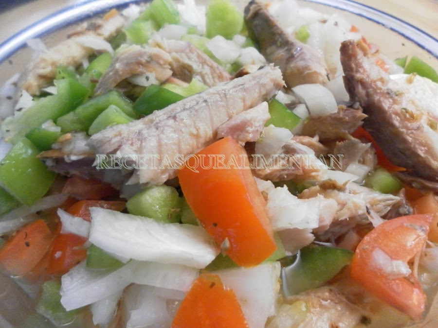2 latas de filetes de caballa en aceite de oliva, 2 tomates, un pimiento verde, una cebolla, 3 dientes de ajo, perejil picado, hierbabuena (opcional), 50 ml vinagre, 150 ml aceite de oliva, sal.