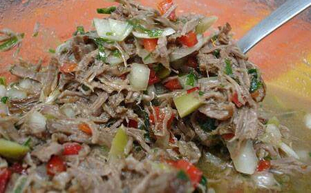 En un tazón colocar la cebolla,chile dulce rojo,verde,apio,culantro mezclar agregar el jugo de naranja,jugo de limón,sal,azúcar,tabasco,pimienta revolver bien agregar la carne desmechada fría revolver y servir,también puede colocar todo en el procesador menos el jugo de naranja y limón procesar bien agregar el jugo de naranja,limón y servir.