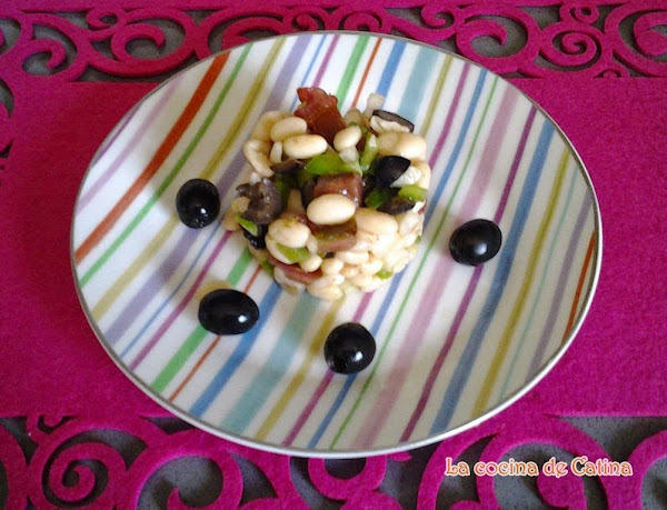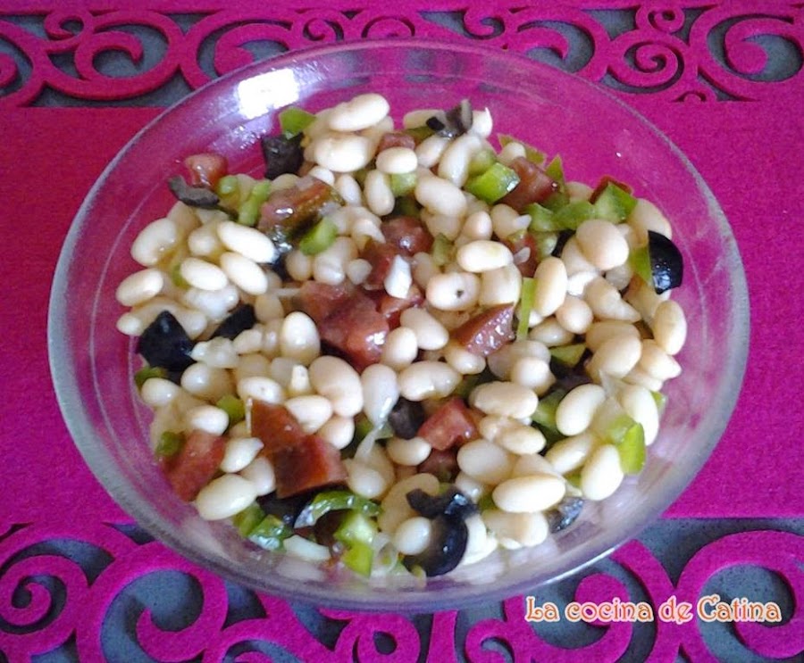 Preparación: Poner las habichuelas a remojo la noche de antes, se lavan bien y se ponen a cocer en una olla con agua, los ajos, la cebolla y la hoja de laurel, en la olla rápida 10 minutos, en olla normal 45 minutos. Si te gustan las de bote, te ahorras todo este proceso. Se les quita toda el agua y se dejan enfriar. Mientras se parten en trocitos pequeños el pimiento, la cebolleta el tomate y las aceitunas. Mezclamos todo con las habichuelas, le ponemos sal y la vinagreta (hecha con el aceite y el vinagre) removemos la mezcla y se deja reposar en el frigorífico un buen rato.