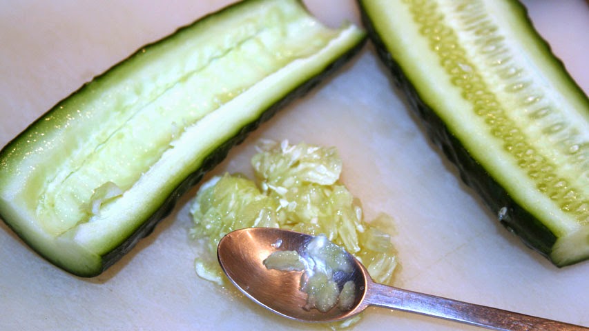 Al pepino no lo pelo y le retiro las semillas del interior con una cucharilla.