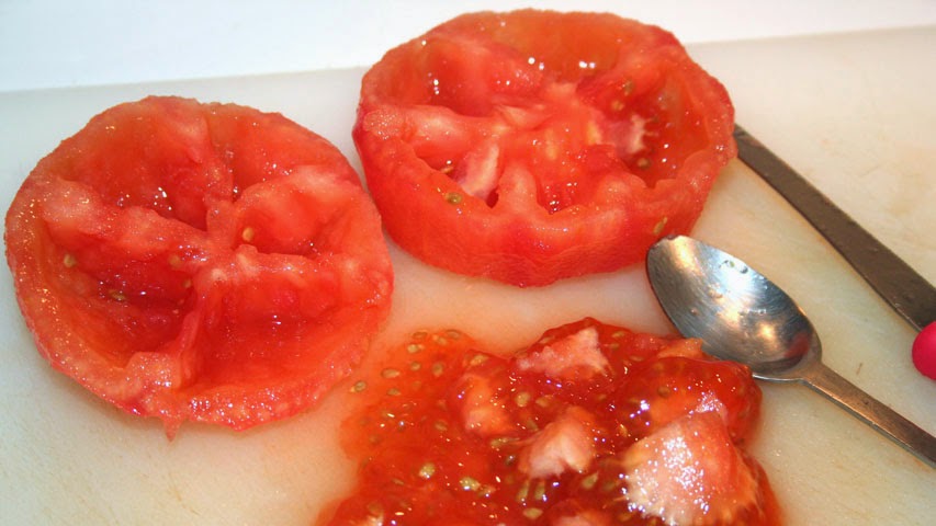 El tomate lo pelo y le quito las semillas y el agua de su interior.