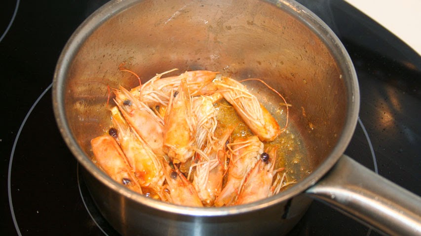 Saltea también en esa cazuela las colas de los langostinos sazonadas. En menos de un minuto retíralas y resérvalas.