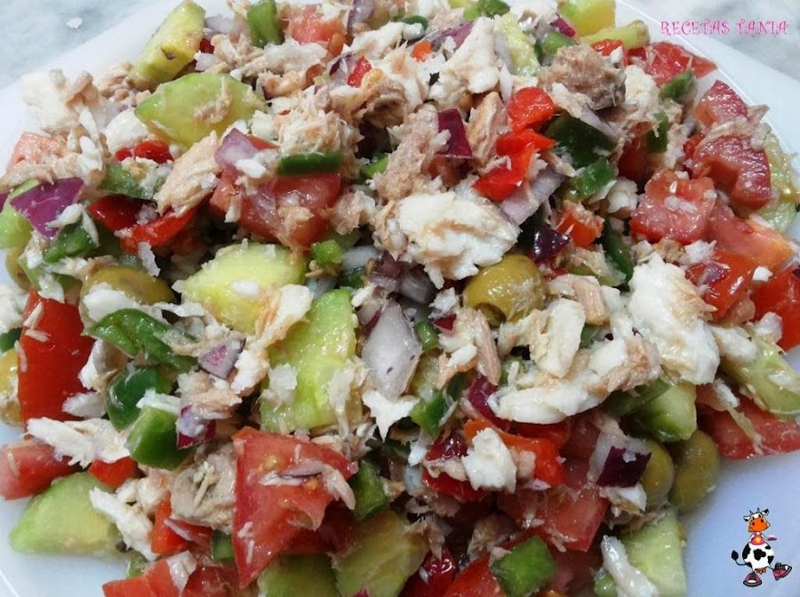 Hervimos o hacemos a la plancha el pescado y luego desmenuzamos. Lavamos, picamos en trozos pequeños los pimientos y la cebolla. Lo ponemos en un bol o ensaladera,lavamos el tomate y lo picamos,pelamos y lavamos el pepino y lo cortamos en trocitos. Añadimos el atún,las aceitunas y el lenguado desmenuzado. Aliñamos con vinagre,aceite de oliva virgen extra y sal. Removemos bien y a comer.