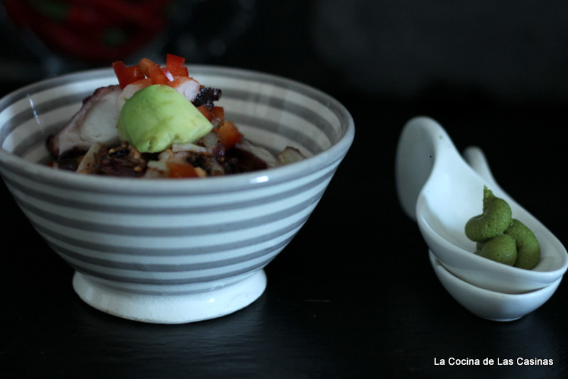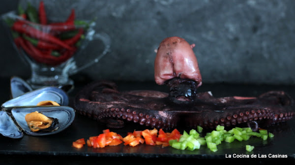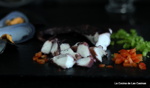 Pasta de Wasabi (opcional para acompañar)Pica en brunoise o cuadraditos muy pequeños los pimientos y la cebolla. Cuece el pulpo como te conté aquí. Corta las patas en lonchitas finas. Abre los mejillones tapados en una sartén con un poco de agua y sal.