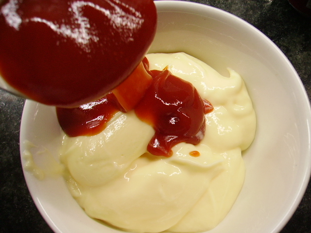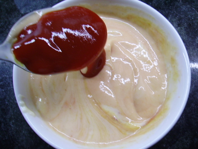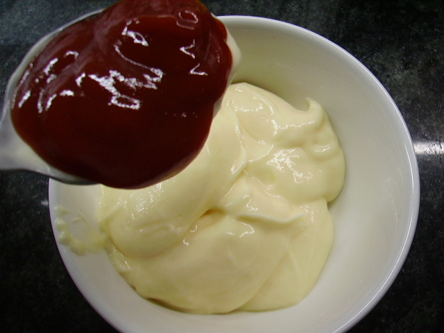 4.- En un bol mezclamos la mayonesa con el ketchup y la mostaza, removemos y si queremos dar más color agregamos mas ketchup.